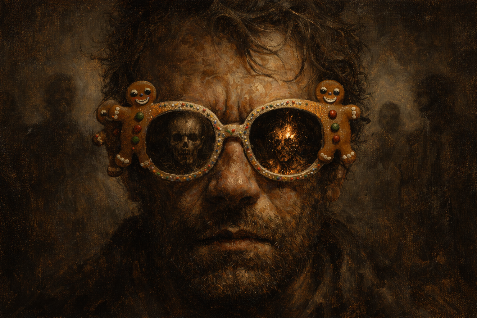 But the shopkeeper warned that if you wore them, the world would not become festive… it would become honest. Through the sugar-coated frames, every person’s true shape appeared: some hollow, some cracked, some quietly burning from within. And if you stared too long at someone who had no soul left, the little gingerbread men on the glasses would slowly turn their heads toward you — because they had finally found a vacancy.